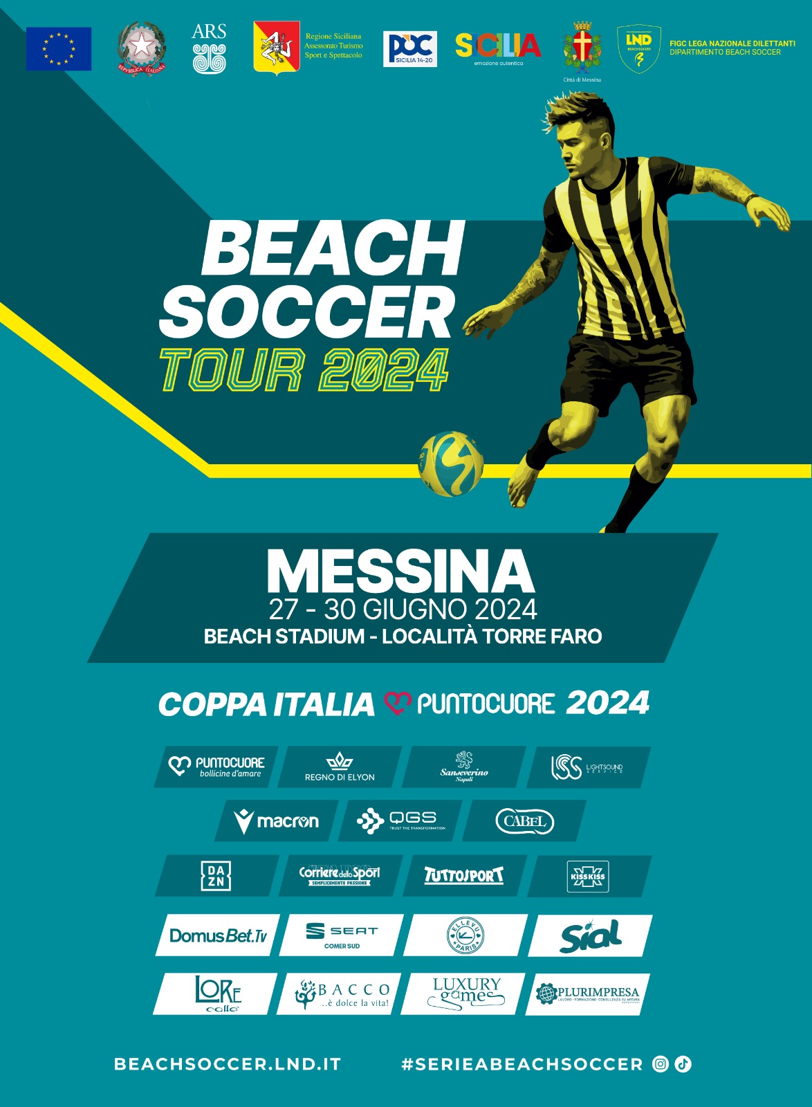 The FIGC-Lega Nazionale Dilettanti Beach Soccer makes a stop in Messina. From 27 to 30 June 2024, sixteen teams will compete for the Coppa Italia Puntocuore at the Arena Beach Stadium in Torre Faro.