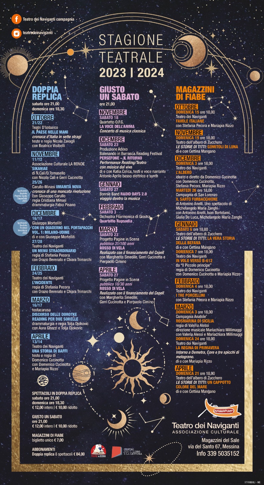 The Teatro dei Naviganti (Messina), also known as Magazzini del Sale, presents itself for the 2023/2024 season with a programme full of guests. Below are the shows scheduled: