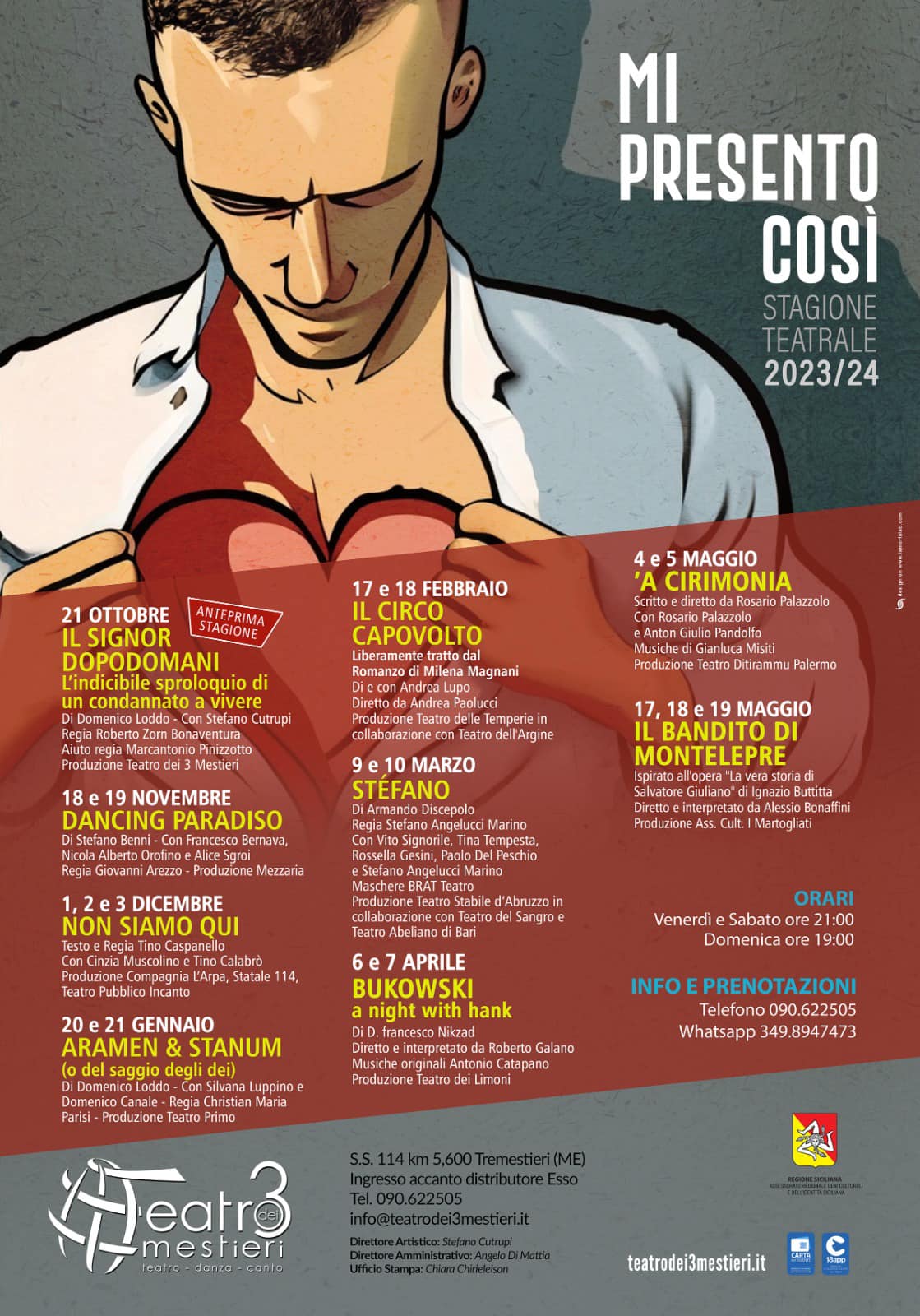 “Mi presento così” is the title of the 2023/2024 theatre review of the Teatro dei 3 Mestieri in Messina. Below are the next scheduled performances: