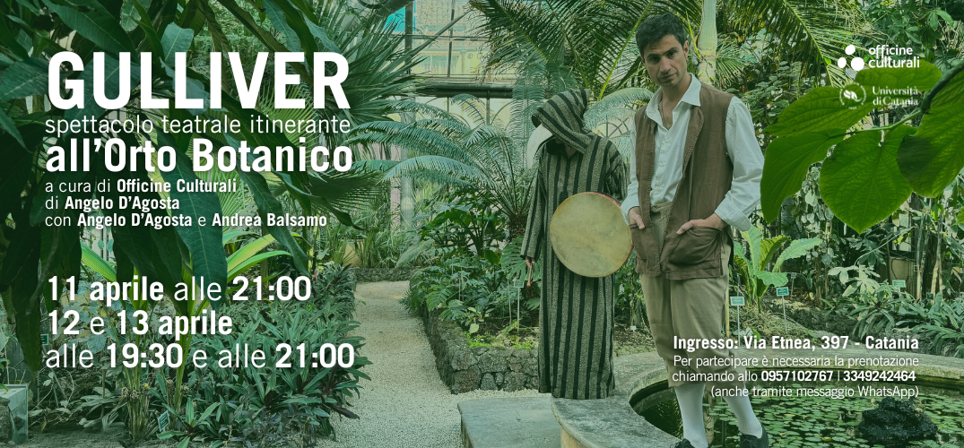 El viernes 11, el sábado 12 y el domingo 13 de abril de 2025, el Jardín Botánico de Catania acogerá «Gulliver», un nuevo espectáculo teatral itinerante concebido e interpretado por Angelo D’Agosta, con música de Andrea Balsamo.