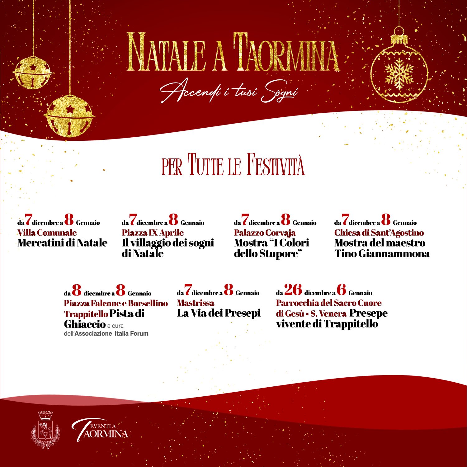 Taormina ofrece una experiencia navideña que realza la tradición y el territorio con eventos repartidos por el centro histórico y sus aldeas. La ciudad, con su belleza natural y el encanto de su historia, se convertirá en escenario de conciertos, representaciones teatrales, mercados de artesanía, exposiciones y actividades familiares, así como de momentos de celebración religiosa que honran el corazón espiritual de la Navidad.