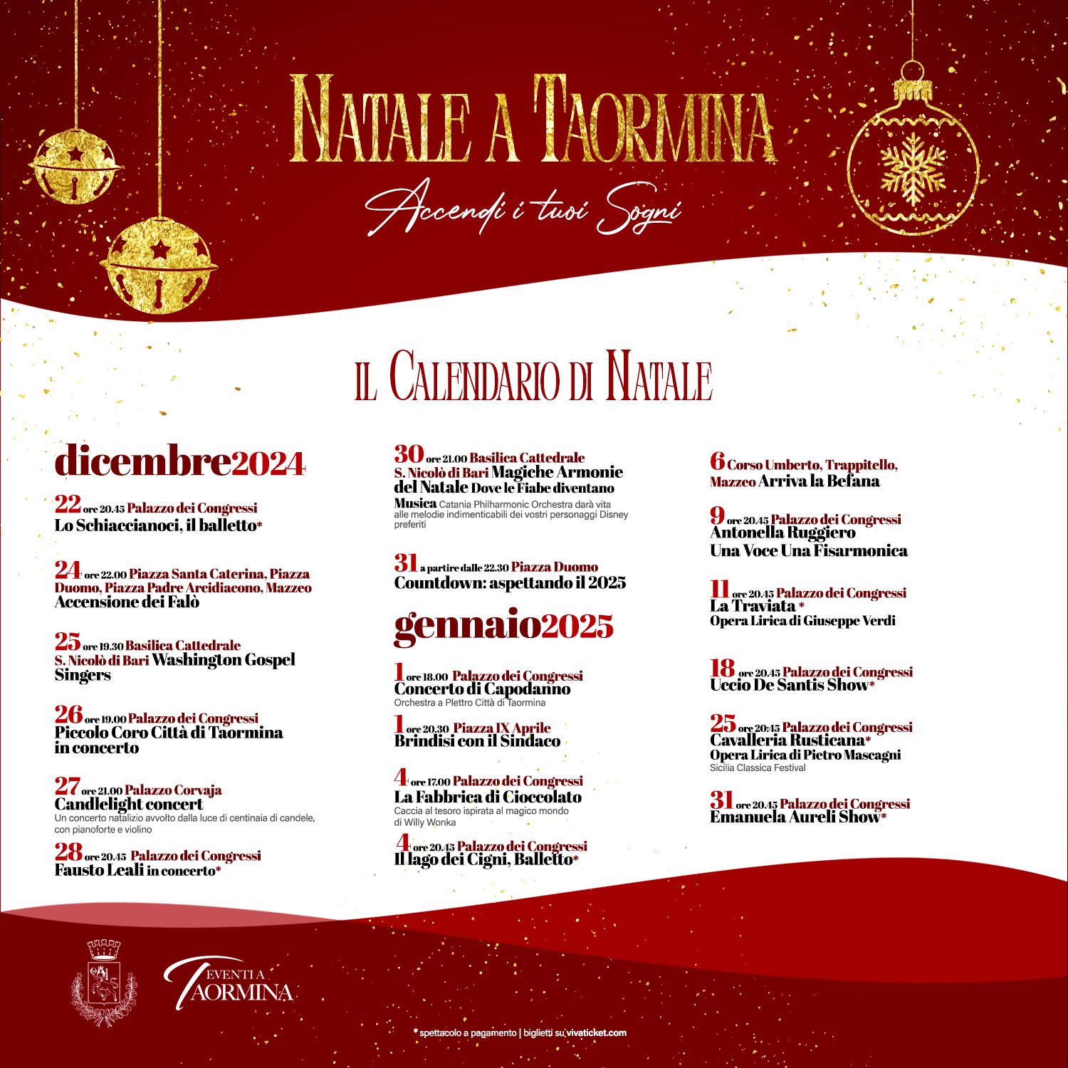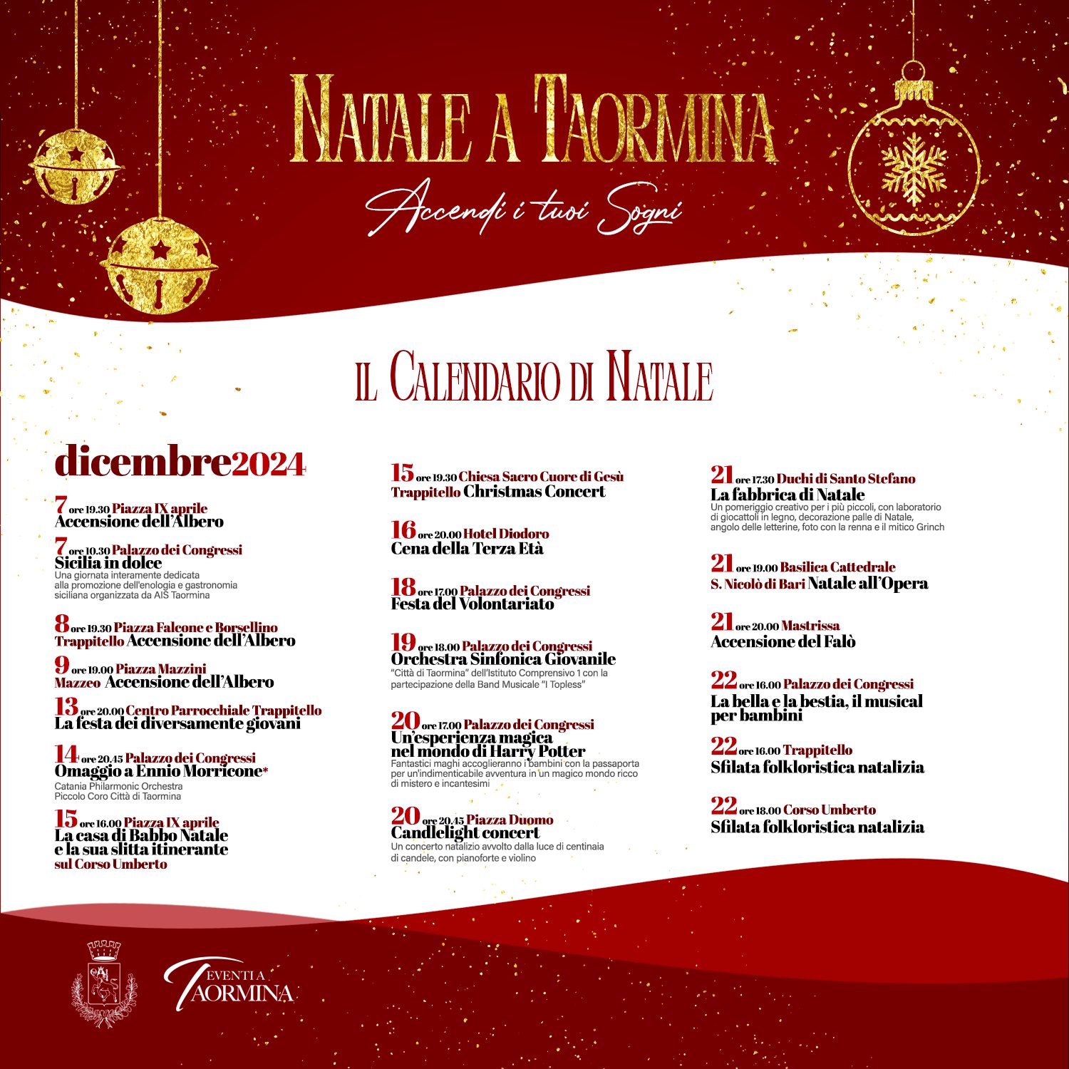 La Navidad en Taormina se enriquece de magia con un programa que abarca más de dos meses de eventos, pensados para acompañar a ciudadanos y visitantes desde la antesala de las fiestas hasta el comienzo del Año Nuevo. El calendario de eventos navideños, dividido en dos momentos principales, incluye «Esperando la Navidad» a partir del 17 de noviembre de 2024, con iniciativas preparatorias y de entretenimiento, y una rica programación dedicada a las fiestas propiamente dichas, que se prolongará hasta el 31 de enero de 2025.