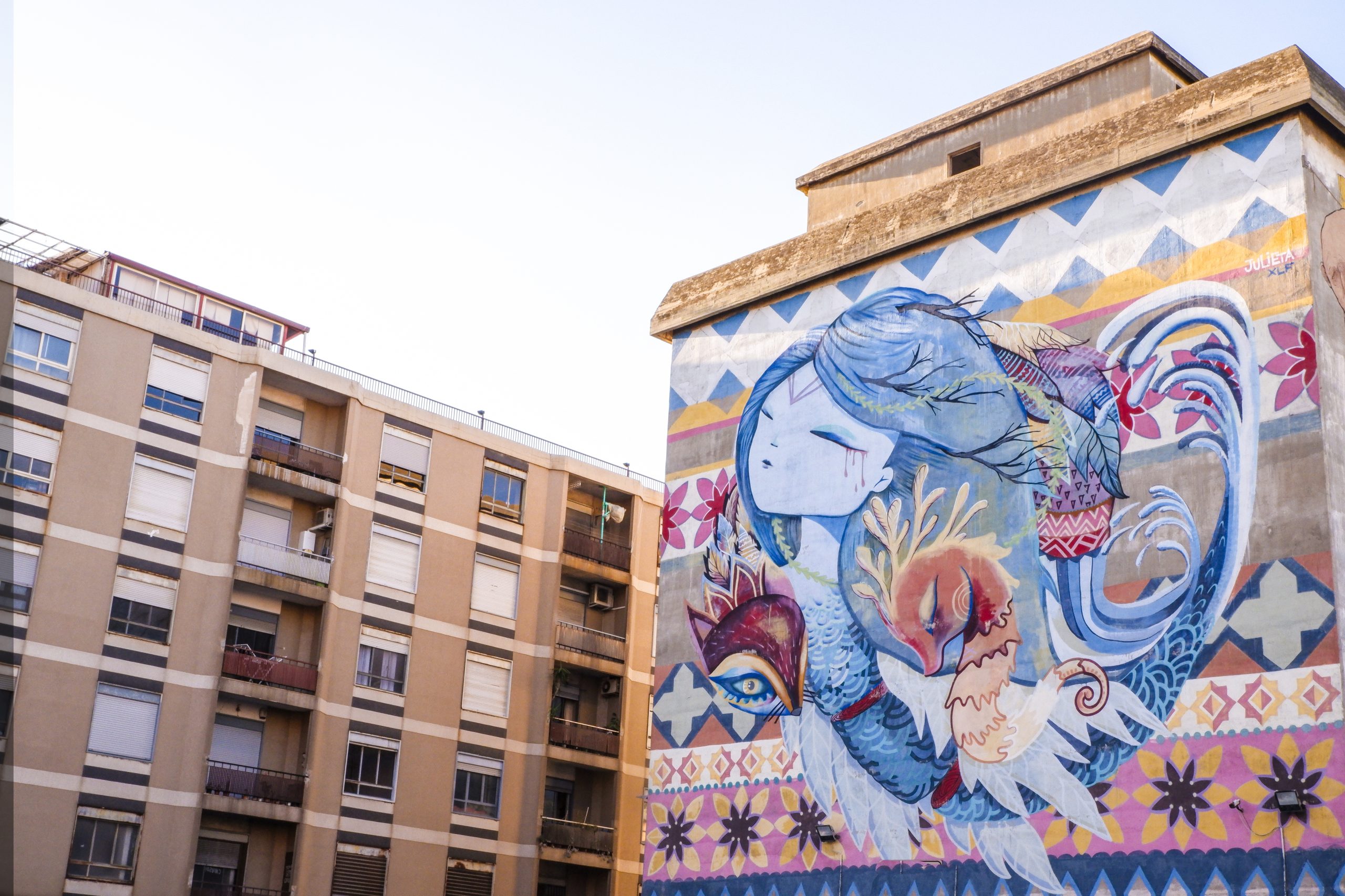 Adentrémonos ahora en la ciudad. En 2013, el conocido artista Blu dejó huella de su paso, con una obra titulada La caccia al pesce spada (La caza del pez espada): una denuncia social, civil y cultural contra la degradación, realizada en la Casa del Portuale. A partir de aquí, otros artistas han seguido su ejemplo. Empezando por uno de los murales más famosos, Without name de Nemo’s, que representa cuatro cuerpos desnudos colgados como si fueran sábanas tendidas. Una obra dedicada a la atleta somalí Samia Yusuf Omar y a todos los que perdieron la vida en el Mediterráneo. La metáfora es muy fuerte: es la desnudez de los cuerpos colgados lo que provoca un escándalo, no la propia muerte, que gotea de los cuerpos colgados.