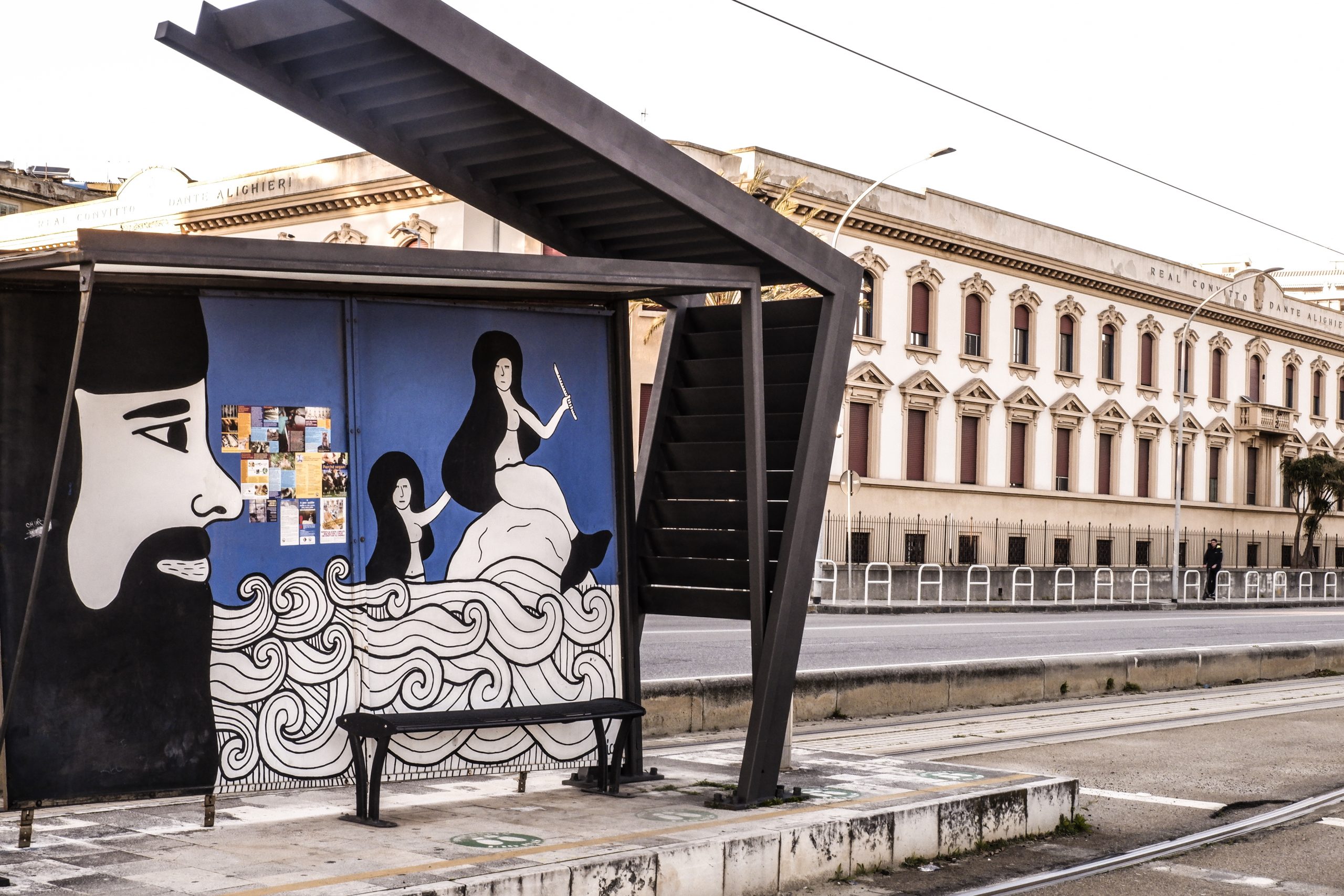 El mismo tema aparece también en la colorida obra de la artista española Julieta. La artista representa una sirena llorando rodeada de mayólicas sicilianas. El mural Lillo de Seacreative habla de las dificultades del trabajo en el mar. La obra de Luca Zamoc, Giasone y el Dragón, cuenta los mitos marinos. La obra está realizada con los colores de la ciudad (rojo y amarillo) y representa al comandante de los argonautas en búsqueda del vellocino de oro. No te pierdas El cangrejo ermitaño y el marinero de Anc y Poki. Una obra que representa un gigantesco cangrejo ermitaño coronado por el faro, y que resume los símbolos de la ciudad. ¿Está cansado? Para descansar, compre un billete y súbase al tranvía. Disfrute de un recorrido de arte callejero por la ciudad. En cada marquesina encontrará una pintura, creada gracias a los esfuerzos del proyecto “Distrart – Distretto d’arte urbana”. Un viaje a través de los mitos de Colapesce, Caribdis, los gigantes locales Mata y Grifone, Ulises y sus sirenas.