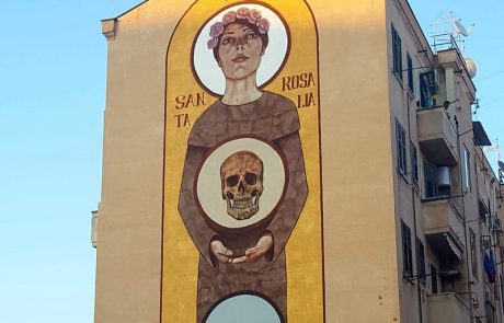 Empezamos en el barrio de Albergheria, cerca del mercado de Ballarò. Aquí encontramos algunos de los murales más interesantes de la ciudad. El primero es el gigantesco mural Viva Santa Rosalía de Igor Scalisi Palminteri. La santa sonríe, casi orgullosa de su ciudad. Entre las estrechas calles nos encontramos con FIDES de Andrea Buglisi. Vemos una representación de un colibrí que levanta una roca con sus pequeñas alas. La obra simboliza la determinación de completar tareas aparentemente imposibles, tal y como puede hacer el arte. También en el barrio de Albergheria, Crazyone ha creado uno stencil de Franco Franchi. En el corazón del histórico mercado de Ballarò, encontramos el mural de San Benedetto el Moro, obra de Igor Scalisi Palminteri. El santo era el patrón de la ciudad junto con Santa Rosalía y, en la obra, protege una plaza reedificada. El campo de fútbol se ha convertido en un símbolo de integración cultural.
