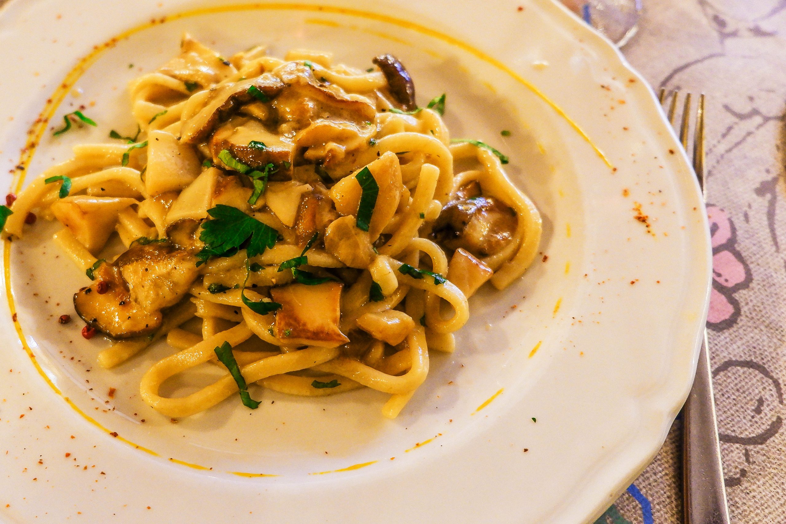 TALLARINES CON SETAS PORCINI. Calienta el aceite (o la mantequilla) y un diente de ajo en una sartén. Limpia los champiñones, córtalos en rodajas y ponlos en la sartén. Fríe durante unos 10 minutos. Si quiere, también puede cocer algunos tomates en la salsa (los tomates cherry serían perfectos). Sal, pimienta y perejil. Mientras tanto, cuece los tallarines en una olla, escúrrelos y pásalos por la sartén con la salsa.