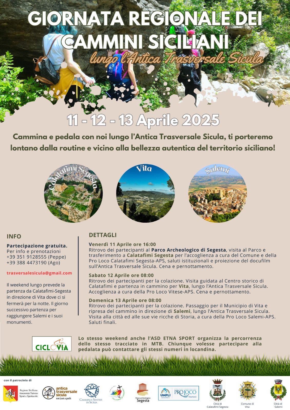 Partecipa alla Giornata Regionale dei Cammini Siciliani, un’esperienza unica per scoprire la Sicilia attraverso la Trasversale Sicula. Percorri a piedi e in bicicletta un tratto suggestivo che unisce storia, cultura e natura, con il supporto di esperti e guide locali. In collaborazione con il Parco Archeologico di Segesta, le Pro Loco locali e l’Assessorato Regionale al Turismo, questa è l’occasione per vivere la Sicilia autentica.