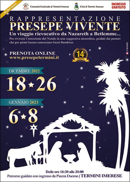 - Le date della rappresentazione del Presepe Vivente di Termini Imerese sono: 18 e 26 Dicembre 2022 e 6 e 8 Gennaio 2023 dalle ore 17.00 alle ore 20.00 in piazza Duomo a Termini Imerese.