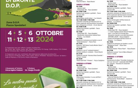 Domenica 13 ottobre sarà la giornata clou, con la tradizionale torta al pistacchio e lo spettacolo serale Sicilia in Festa – 1° Premio Orgoglio Verde Città di Bronte, condotto da Diego Caltabiano, che chiuderà ufficialmente l’evento in piazza Cimbali.