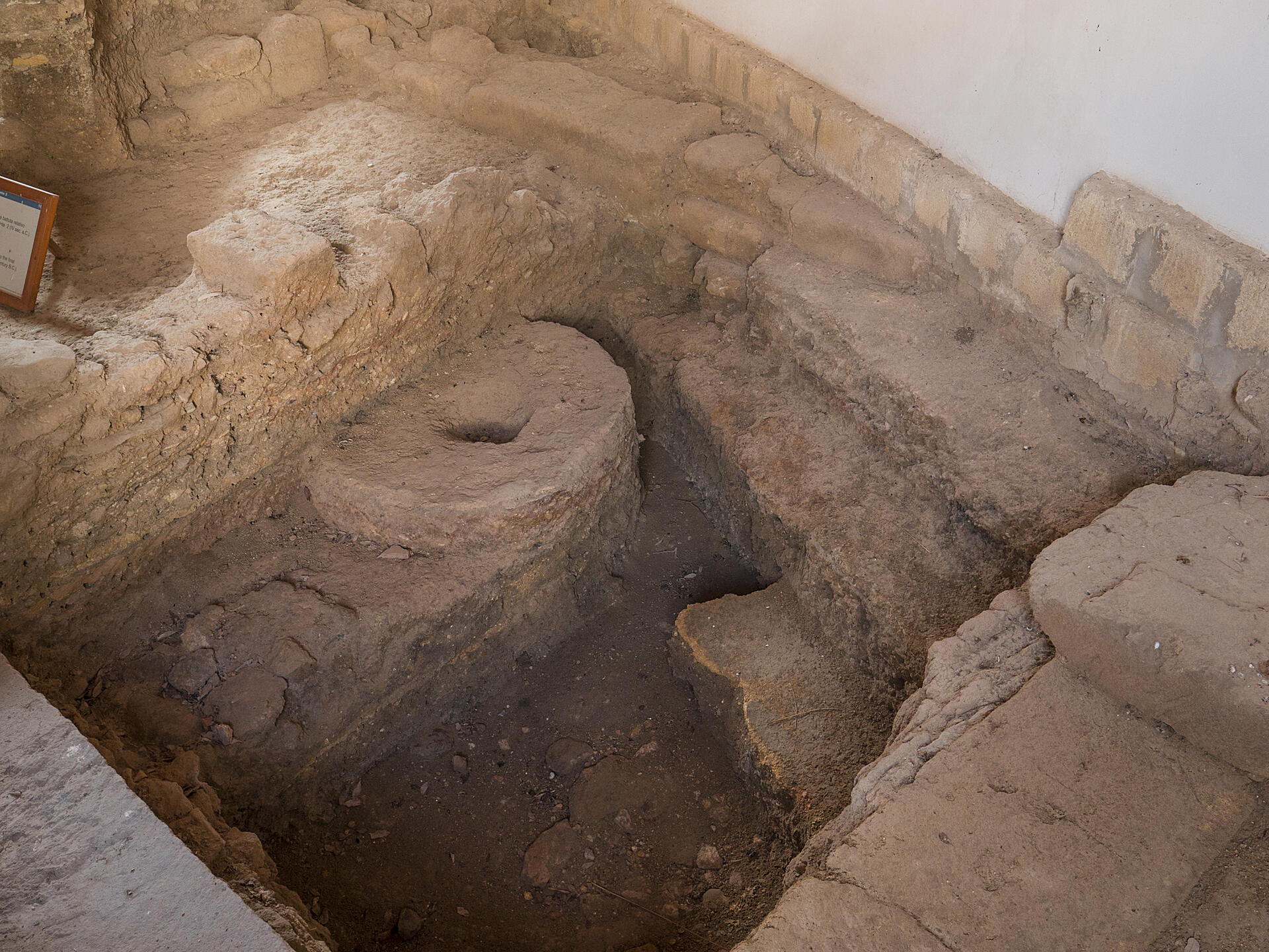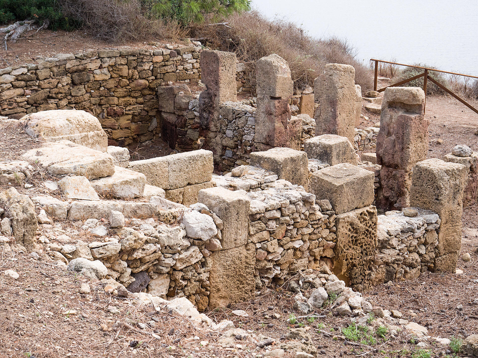 En se dirigeant plus à l’ouest puis à l’est, en longeant les murs ou en passant par les ruelles dans les champs, on atteint la partie sud de l’île, où se trouvent la Porte Sud et le Kothon. Il s’agit d’un port artificiel rectangulaire unique, ressemblant presque à un quai, dont le fond est constitué de roche naturelle lisse et dont les bords sont constitués de blocs carrés lisses. Construit selon les techniques typiques du monde phénico-punique, il date du VIe siècle. L’eau de mer pénètre dans le bassin par un canal étroit, caractérisé par un sillon longitudinal, fait pour tirer les navires à terre. Les quais latéraux étaient utilisés pour l’amarrage des navires et leur entretien.