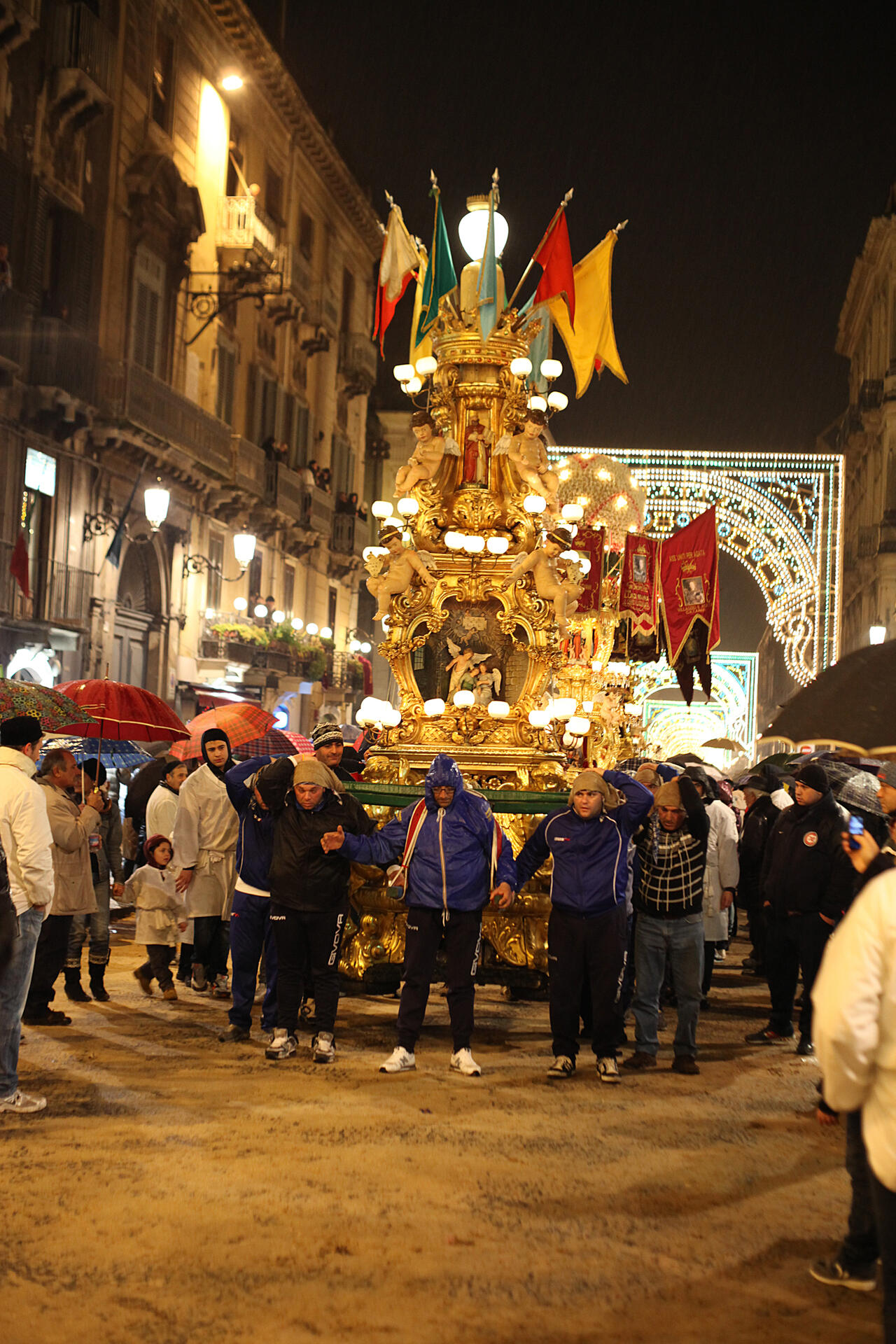 La fête commence par l’offrande de cire, au cours de laquelle les fidèles portent des bougies de différentes tailles, signe de leur dévotion. S’ensuit la spectaculaire procession de la Candelora, avec les chandeliers traditionnels portés sur les épaules par les fidèles. La journée se termine par un feu d’artifice extraordinaire sur la Piazza Duomo.