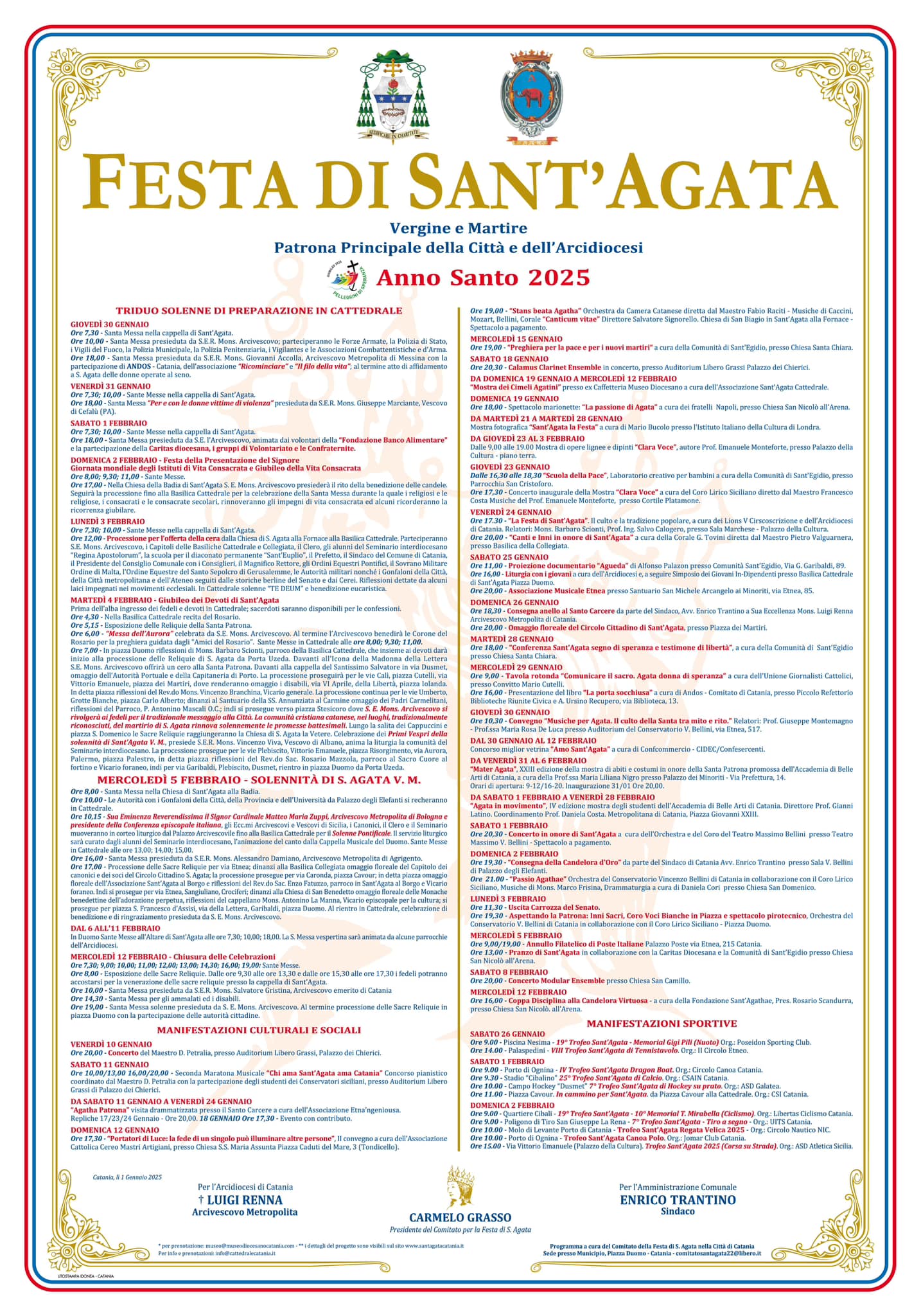 Le programme du festival est enrichi d’initiatives culturelles et de réflexion, parmi lesquelles une conférence historique sur le culte des premiers martyrs chrétiens et la remise du Prix de l’Archidiocèse de Catane, intitulé “Sant’Agata, témoin de foi, d’espérance et de charité”, à ceux qui se sont distingués par leur témoignage de foi et leur engagement caritatif.