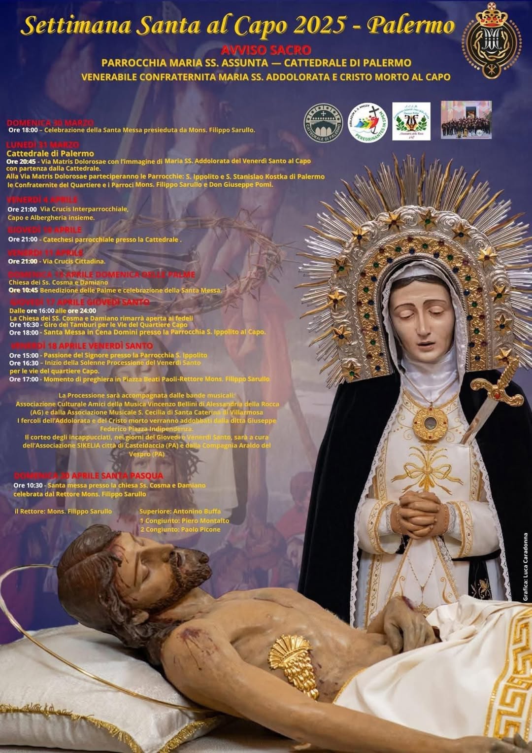 Semaine Sainte au Cap 2025, organisée par la Paroisse Maria SS. Assunta – Cathédrale de Palerme et la Vénérable Confrérie Maria SS. Douleurs et Christ mort en tête, c’est un moment d’intense spiritualité et de dévotion populaire.