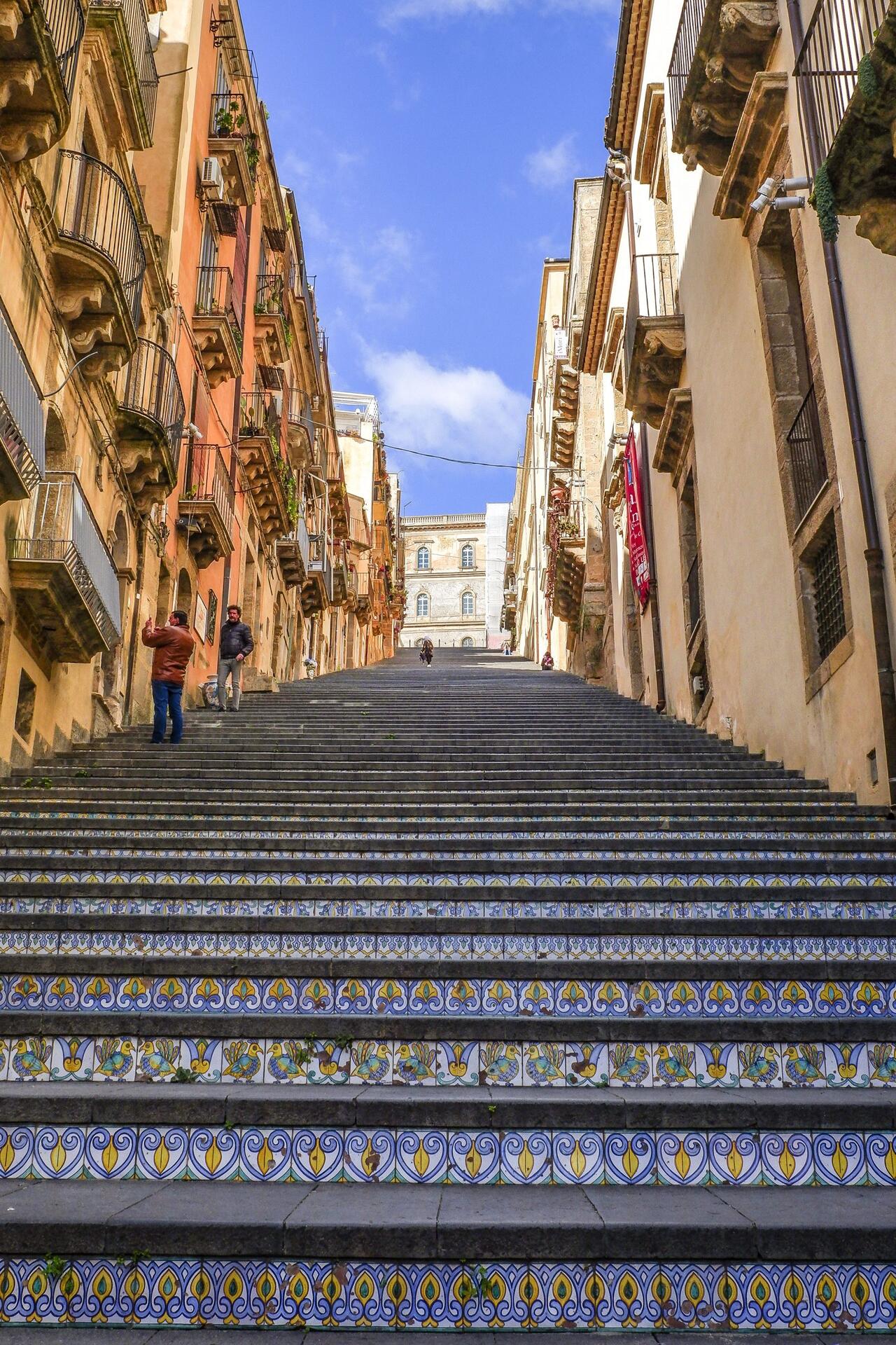 Scendendo di altitudine, a 50 km da Mazzarino, già nel territorio della provincia di Catania, passiamo da Caltagirone. Sicuramente in questa splendida città possiamo sgranchire le gambe percorrendo la famosa Scalinata di Santa Maria del Monte, lunga 130 m con i suoi 142 scalini, interamente decorati dalle coloratissime ceramiche tipiche del luogo.